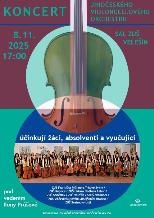 V sobotu 8. 11. 2025 se v koncertním sále ZUŠ Velešín uskuteční od 17:00 koncert Jihočeského violoncellového orchestru, v jehož řadách vystupují i žáci naší základní umělecké školy.