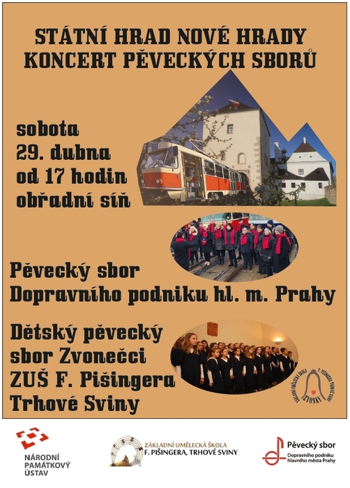 V sobotu 29. dubna 2023 se od 17:00 v obřadní síni Státního hradu Nové Hrady uskuteční koncert našeho pěveckého sboru Zvonečci a pěveckého sboru Dopravního podniku hlavního města Prahy.