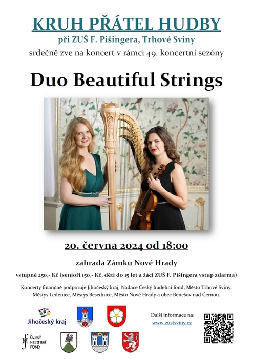 Ve čtvrtek 20. června 2024 proběhne od 18:00 v rámci KPH v zámecké zahradě v Nových Hradech koncert Dua Beautiful Strings.