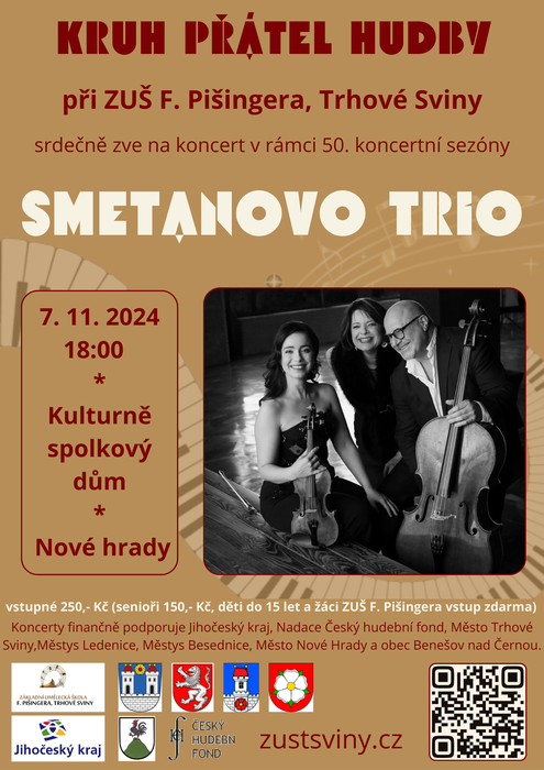 Srdečně zveme na koncert Smetanova tria který v rámci KPH proběhne ve čtvrtek 7. listopadu 2024 od 18:00 v Kulturně-spolkovém domě v Nových Hradech.