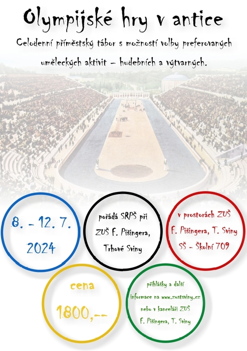 Podrobné informace a přihlášku na letošní příměstský tábor na téma Olympijské hry v antice, který se bude konat v termínu 8. - 12. července 2024, naleznete v sekci Aktivity -> Příměstské tábory.